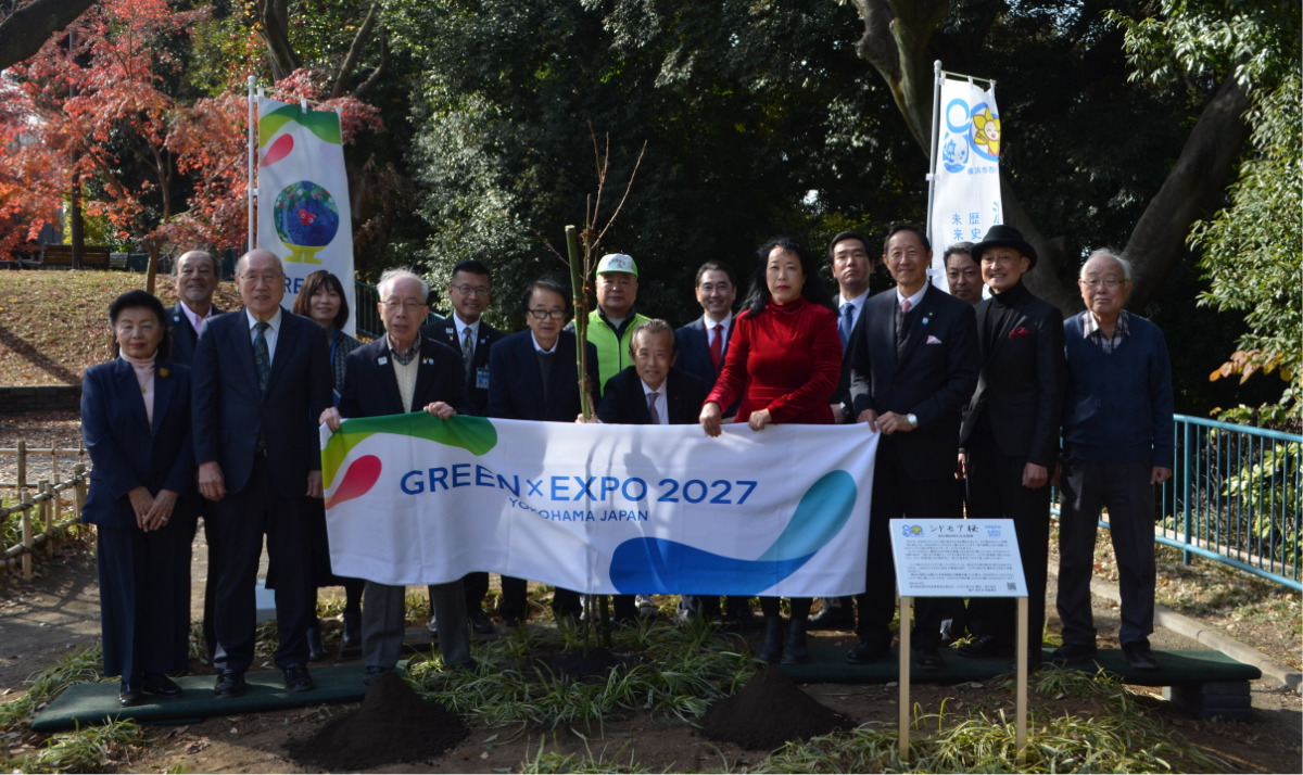 掃部山公園は開港に貢献した井伊直弼公の像が立つ。菊地区長は「井伊直弼公とともに、この桜が西区の今後を見守ってくれると思う。これからも西区、シドモア桜、掃部山公園を皆様に愛してもらえるよう取り組んでいく」とあいさつ。梅本代表理事は「GREEN×EXPO 2027に向けて全区にシドモア桜を植えようというプロジェクトを進めている。ここを拠点にイベントを行うなどし、機運を高めていけたら」と話した。