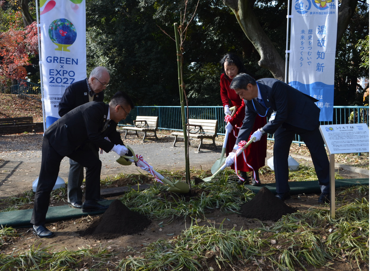 植樹式には、西区制80周年記念事業実行委員のメンバー、菊地健次西区長、地元議員、桜を寄贈したシドモア桜の会横浜の梅本千晶代表理事ら関係者が集まり鍬入れを行った。
