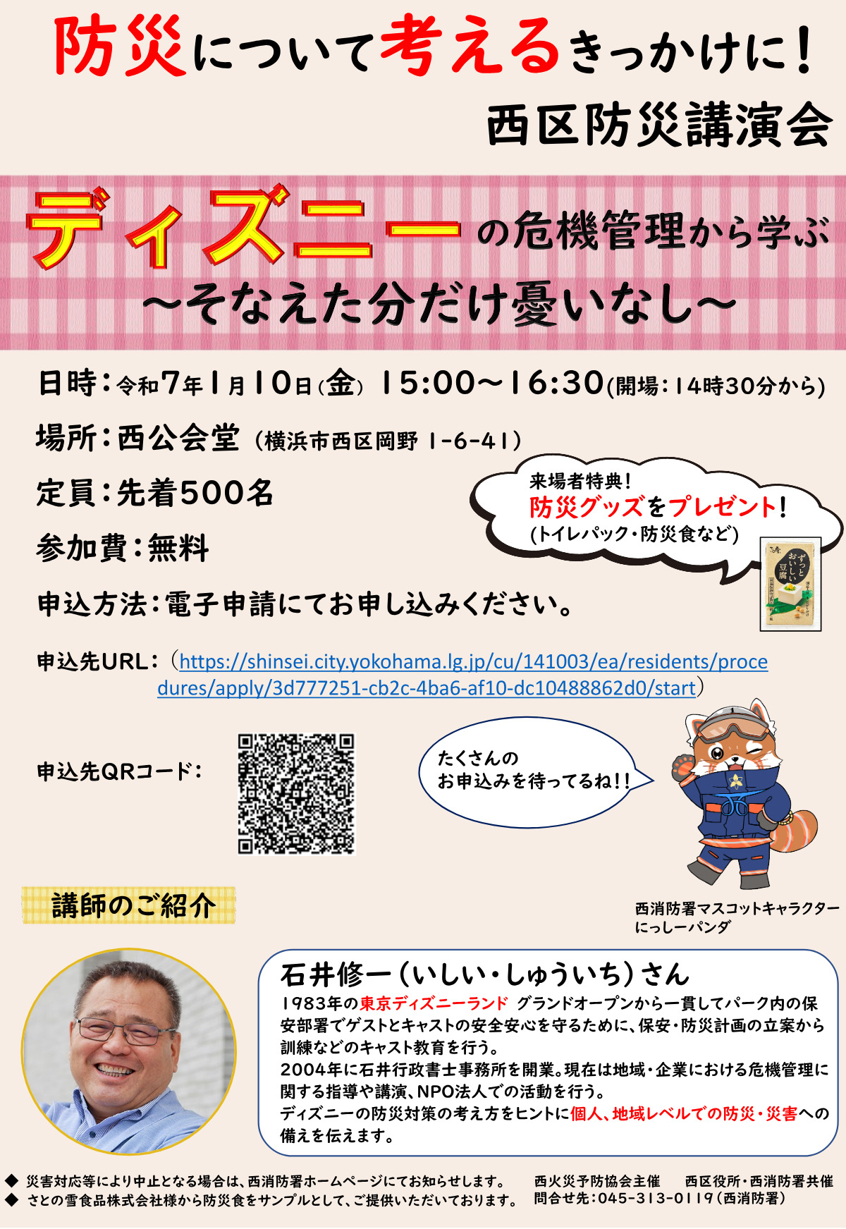 西区防災講演会が2025年1月10日(金)の午後3時から午後4時30分まで、西公会堂=西区岡野=で行われる。西火災予防協会の主催、西区役所と西消防署の共催。