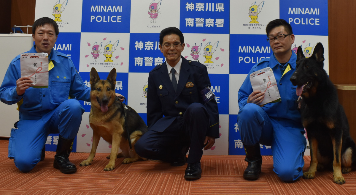 南警察署は12月20日、犯人逮捕に貢献したとして、県警所属のジャーマンシェパードの警察犬2頭を表彰した。