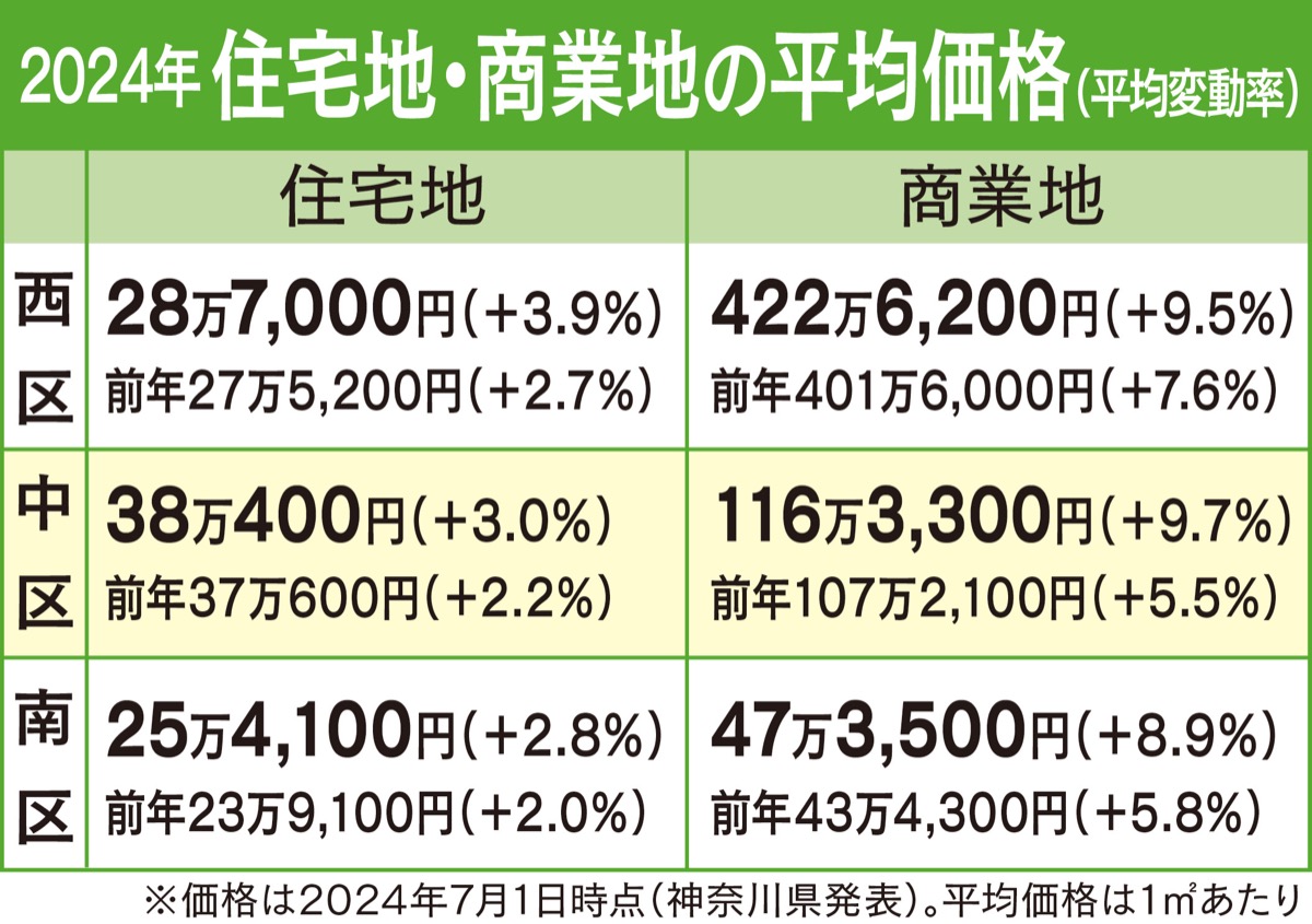 県が昨年公表した地価調査によると、住宅地の平均変動率は、西区3・9%、中区3・0%、南区2・8%と上昇率が拡大。交通利便性が高い横浜市中心部は堅調で、商業地もみなとみらい地区や駅前再開発事業への期待感のある関内駅周辺で、継続して強い上昇傾向が見られた。