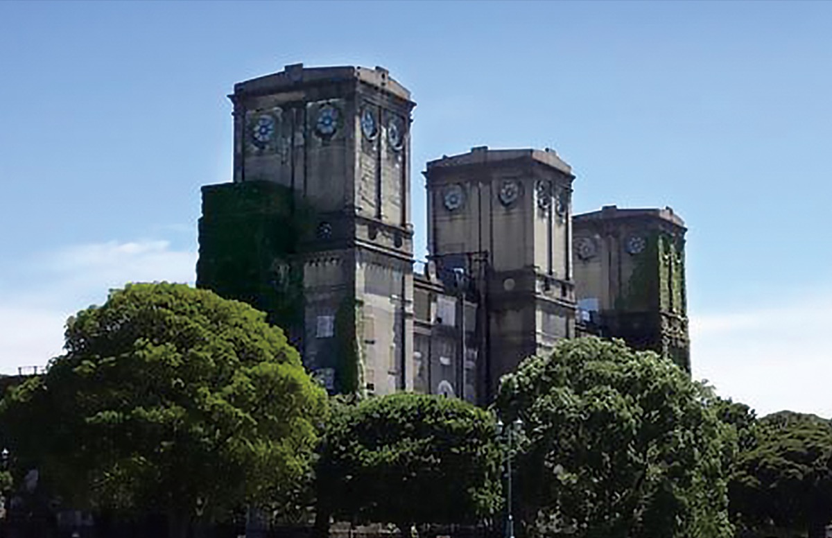旧根岸競馬場は1866年に開設。観覧施設である一等馬見所は1929年、関東大震災で崩壊した馬見所に代わり建設された。鉄骨鉄筋コンクリート造りの7階建てで、延べ床面積は約5千平方メートル。米国建築家J・H・モーガンが設計し、高さ約30メートルの3つ並んだ塔が特徴的だ。並んでいた二等馬見所は老朽化のため、1988年に解体され、現存する国内最古の競馬場建築となっている。2009年、経済産業省から近代化産業遺産の認定を受けた。