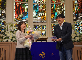 初日に来場し、イベントを体験した河村修二さん(65)・敬子さん(57)夫妻=栄区在住。結婚式さながらの演出で別々にチャペルに入場し、「おいしい料理を作ってくれてありがとう」「人生後半も楽しく過ごしましょう」と、照れながらも互いに感謝の気持ちを伝え合っていた。「恥ずかしかったけれど、日頃の感謝の気持ちを伝えられてよかった」と修二さん。敬子さんは「非日常空間で、ステンドグラスも素敵だった」と話し、「30年前の結婚式や、これまでの家族との出来事を振り返る機会にもなりました」と笑顔を見せていた。
