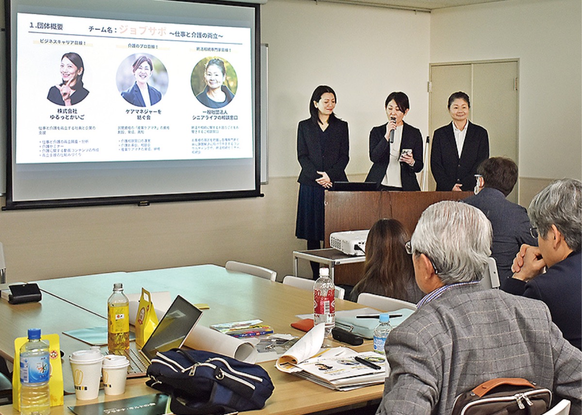 2月の意見交換会では「仕事と介護の両立を目指すプロジェクト」として、介護や終活相談などの事業を行う3者が共同でプレゼン。参加者から具体的な活動内容についての質問が挙がった。