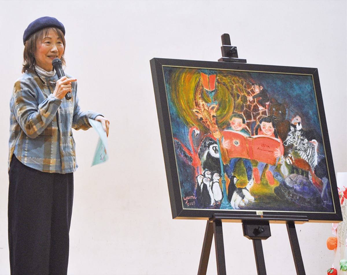 卒業生も式典に参加し、油彩画を寄贈した絵本作家の藤島由美さんは「小学校の頃、野毛山動物園で描いた絵を先生に褒められたことが絵本作家になったきっかけ」と話した。また作編曲家・ギタリストとして活躍する奈良悠樹さんと6年生が合奏を披露。最後に全校児童が心を一つにして歌い上げ、体育館は感動的な空気に包まれた。