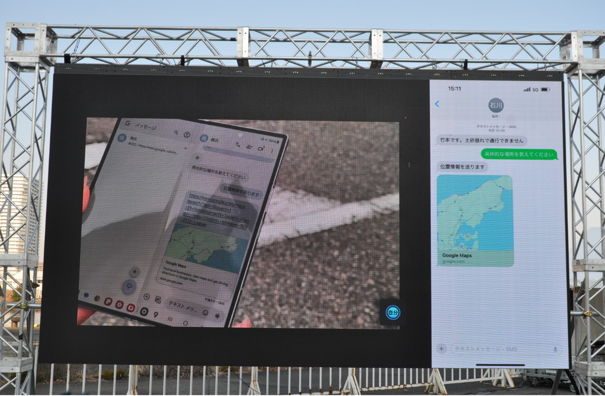 訓練は、空が見える状況であれば圏外エリアでもテキストメッセージの送受信が可能な衛生直接通信サービスを活用。通信衛星「Starlink」とauスマートフォンを使って、横浜と通信途絶エリアを想定した石川県七尾市の別所岳間でSMS送受信のデモンストレーションを行った。このサービスを利用すれば、災害などの緊急時にも自分のスマートフォンで家族や友人と連絡を取ることができる。今年春から本格的に提供を開始する予定だ。