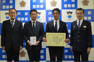 セコム(株)横浜統轄支社=西区北幸=は、「優秀安全運転事業所表彰」の銅賞に選ばれ、3月5日に戸部警察署の飯塚博史署長と自動車安全運転センター神奈川事務所の片山真所長から表彰状を授与された。