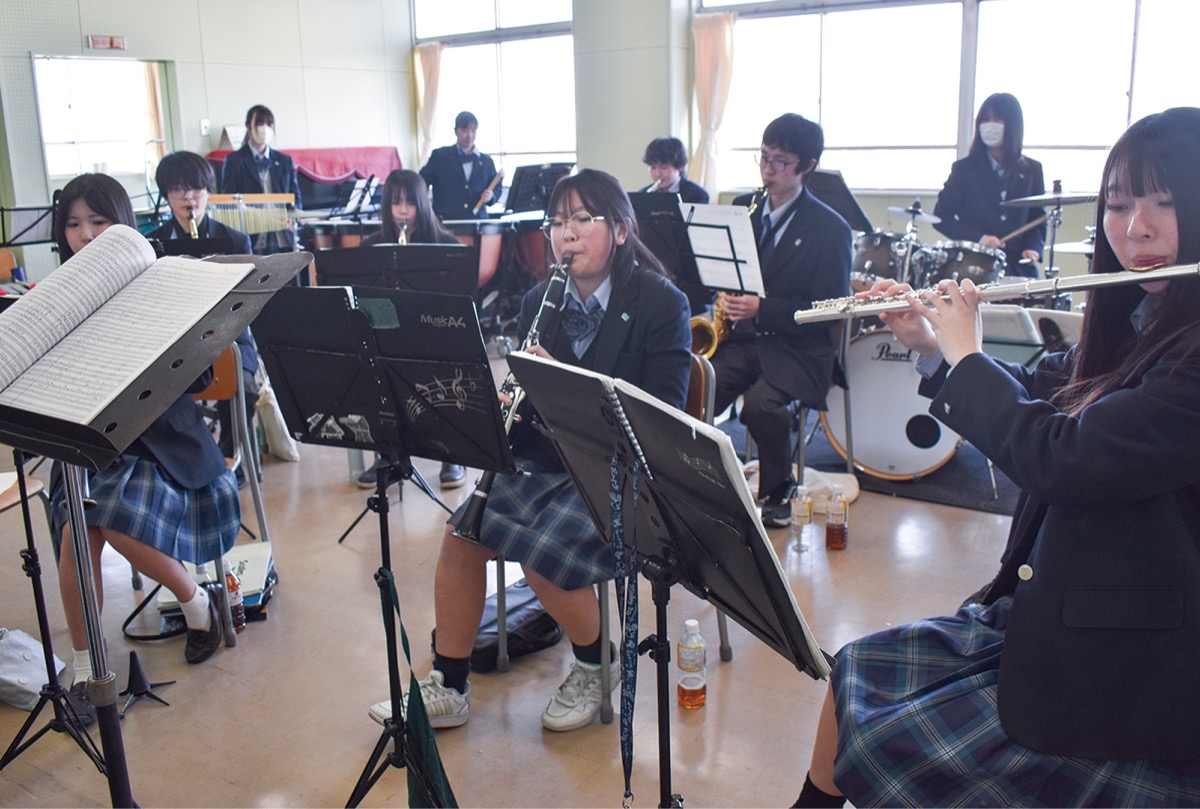 アルプススタンドから力強い演奏で選手を鼓舞する吹奏楽部。3月下旬の定期演奏会に向け練習に励む中、野球部の春のセンバツ出場が決まった。練習曲数が倍増するため、「間に合うかなと不安の方が強かった」と部長の余湖咲姫音(よごさきね)さんは話す。