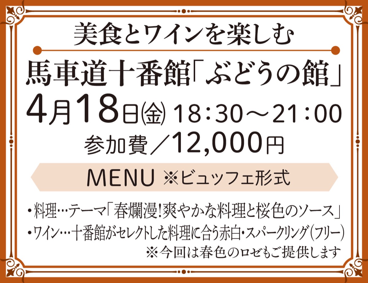 老舗フレンチレストラン「馬車道十番館」で4月18日(金)、美食と共に楽しむワイン会「ぶどうの館」が開催される。