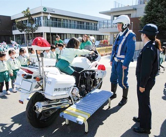 南警察署署員や白バイ隊員らが訪れ、春から小学生になる年長園児を対象に実施。実際に横断歩道を渡る練習では、最初だけでなく途中でも左右を確認することなどを学んだ。また白バイの乗車体験なども行われた。