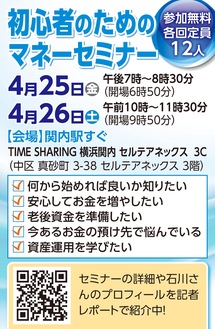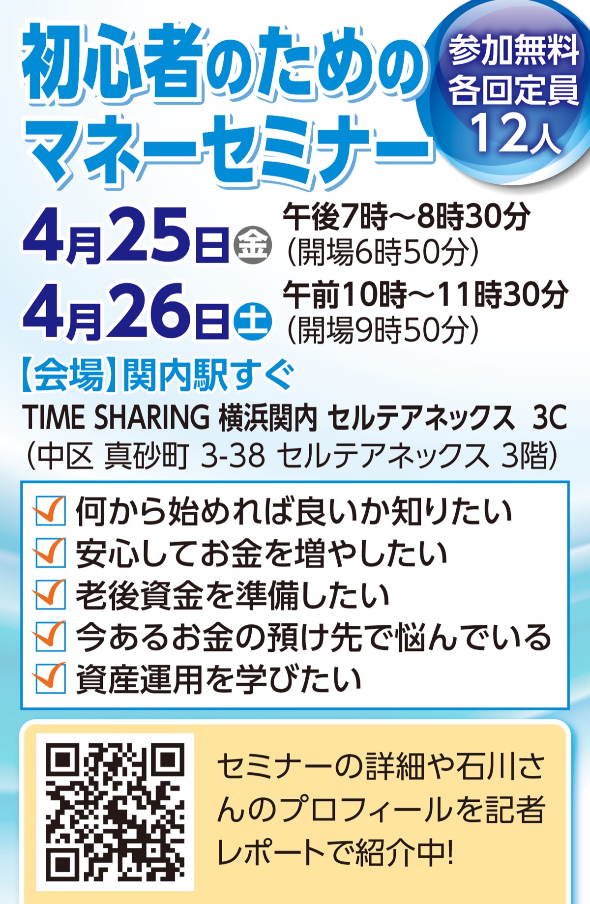 「初心者のためのマネーセミナー」が4月25日(金)の午後7時から8時30分までと26日(土)の午前10時から11時30分まで、関内駅すぐのセルテアネックスで開催される。参加無料。