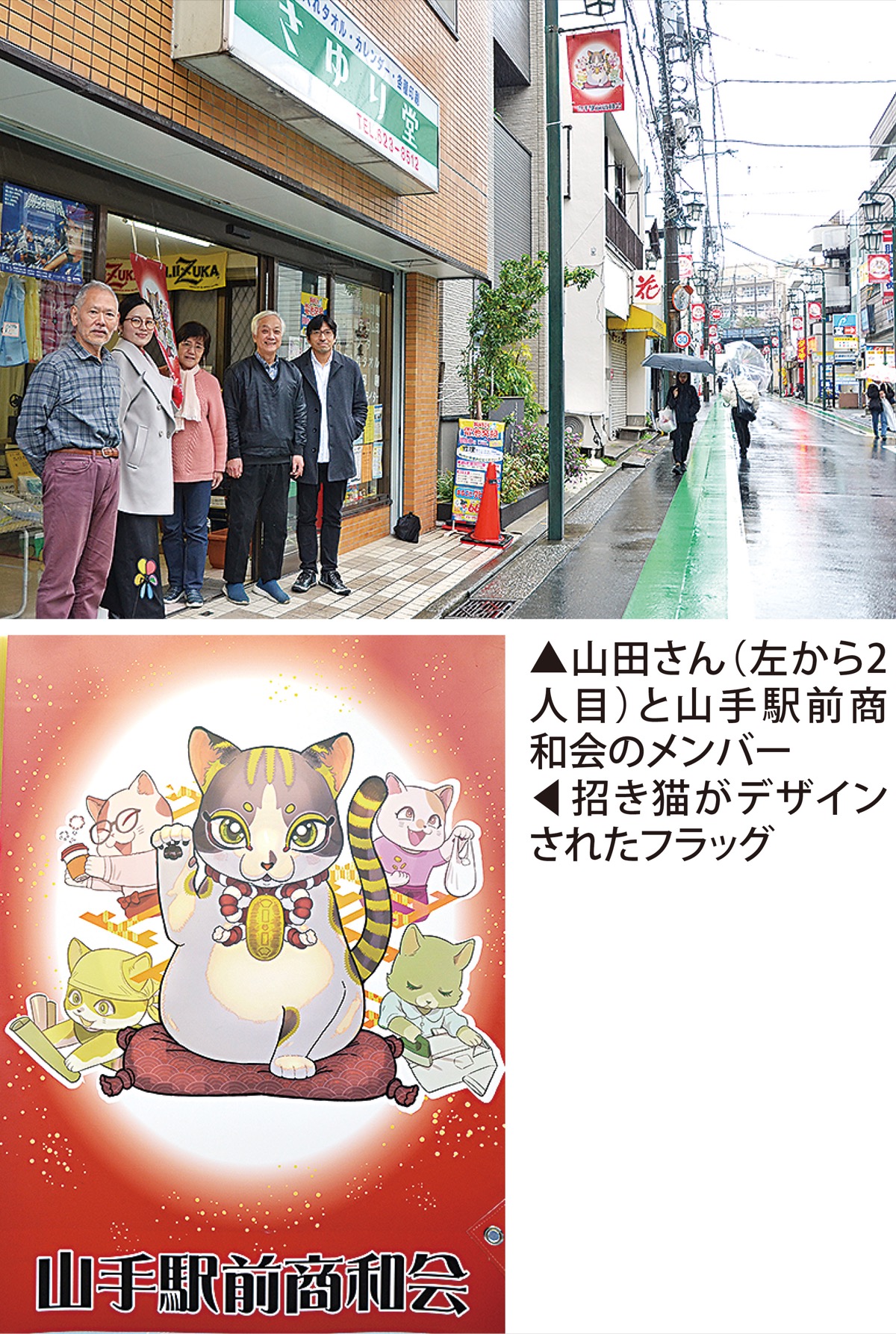 山手駅前の商店街「山手駅前商和会」の街路灯に2月末、パッと目を惹く赤いフラッグが設置された。描かれているのは商売繁盛の縁起物とされる招き猫。イラストは地元の漫画家・山田マリエさん=人物風土記で紹介=が描いたものだ。