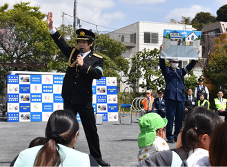 春の交通安全運動(4月6日〜15日)に合わせ、お笑いコンビ「マヂカルラブリー」の野田クリスタルさん(南区六ツ川出身)が4月8日、南警察署の一日署長を務めた。
