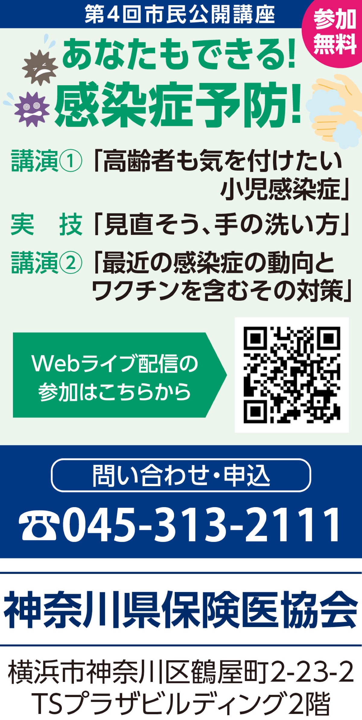 市民公開講座「あなたもできる!感染症予防!」が、5月17日(土)の午後2時30分から4時45分まで、横浜駅西口から徒歩5分の神奈川県保険医協会会議室(2階)で行われる。定員80人で参加無料。同協会の主催。
