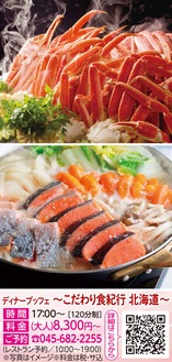 みなとみらい駅直結の横浜ベイホテル東急2階「カフェ トスカ」では、毎年人気のディナーブッフェ「こだわり食紀行 北海道」を開催中(7月16日(水)まで)。土・日・祝日限定メニューには、「イバラガニの炙り レモンを添えて」を用意。目の前で調理するアクションコーナーでは「ジューシーに焼き上げたローストビーフ」などが並ぶ。ほかにも「ズワイガニのスチーム」や「サーモンの石狩鍋スタイル」、「スープカレー」など、北海道を代表する定番メニューの数々を満喫できる貴重な機会だ。