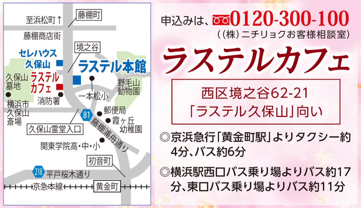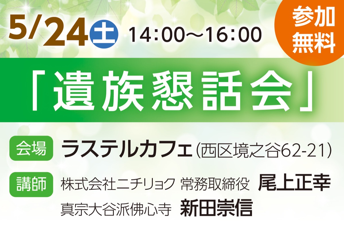 シニアライフサポートの株式会社ニチリョクが運営する「ラステルカフェ」(西区境之谷62の21)で5月24日(土)、遺族懇話会が開かれる。午後2時から4時まで。