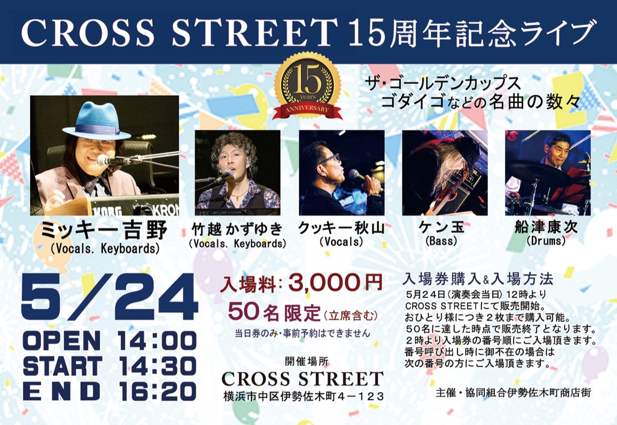 イセザキ・モール中央にある多目的スペース「クロスストリート」(中区伊勢佐木町4)が開館15周年を記念し5月24日(土)、特別ライブを開催する。午後2時30分開演(開場2時)。