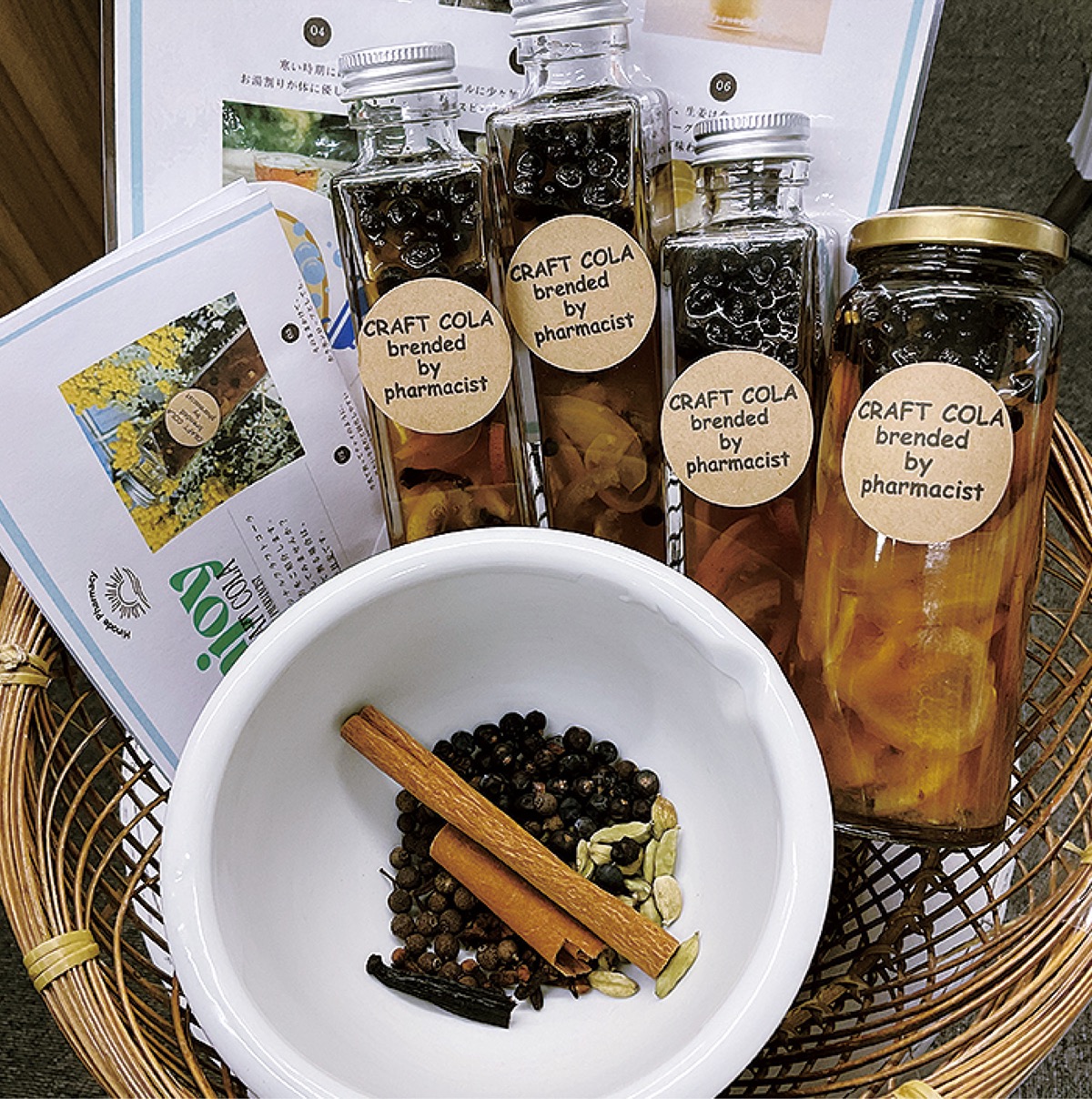 レシピを考案したのは同薬局薬剤師の高橋信洋さん。「最近の薬局は処方箋がないと入りにくい場所になっている。もっと気軽に薬や健康について薬剤師に相談してもらいたい」。街の人との接点になればと、2022年11月から「薬剤師が作るクラフトコーラ」を掲げて地域のイベントに出店したところ、好評に。「コーラをきっかけにお店を知ってもらえたり、健康相談につながった」と話す。