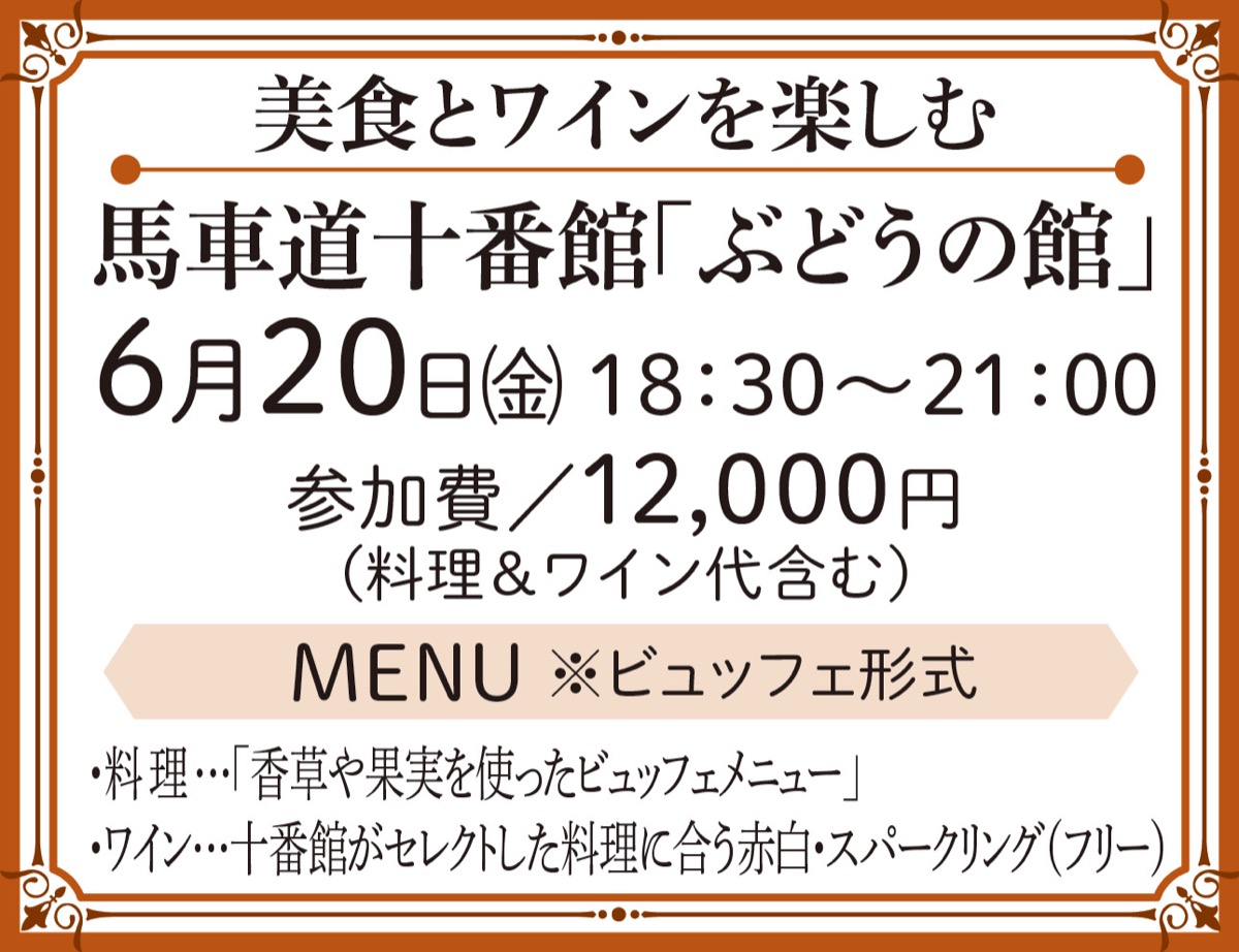 老舗フレンチレストラン「馬車道十番館」で6月20日(金)、美食と共に楽しむワイン会「ぶどうの館」が開催される。