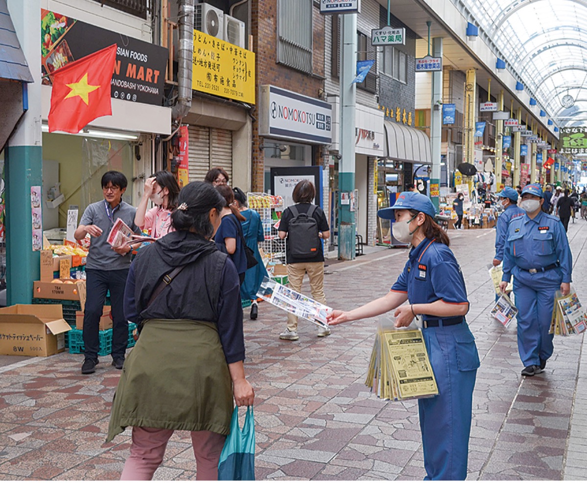 南区は、外国籍を持つ人の割合が区内人口の5・7%と市内で2番目に高い(2023年時点)。同商店街も多くの外国人が利用することから、南消防団の外国人防災指導チームも参加。同商店街の協力で中国語、韓国語、日本語の3カ国語で熱中症予防を呼びかける放送を行った。
