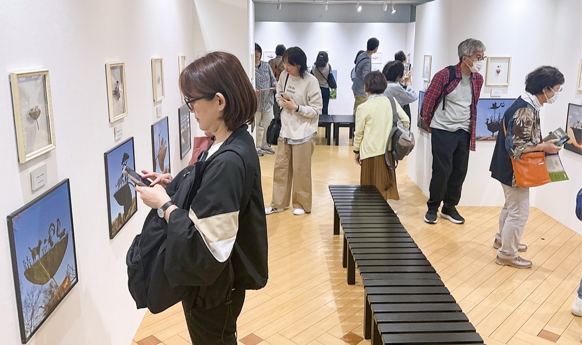 会場ではオリジナルグッズの販売やフォトスポットも。港北区から来ていた深澤美樹さん(54)は、1年前からSNSでリトさんの作品を知ったといい「タイトルと切り絵がすごく合っていて。見るとほっこりします」と笑顔に。原画を見るのは初めてだといい「実物は本当に細かいですね」と驚いていた。
