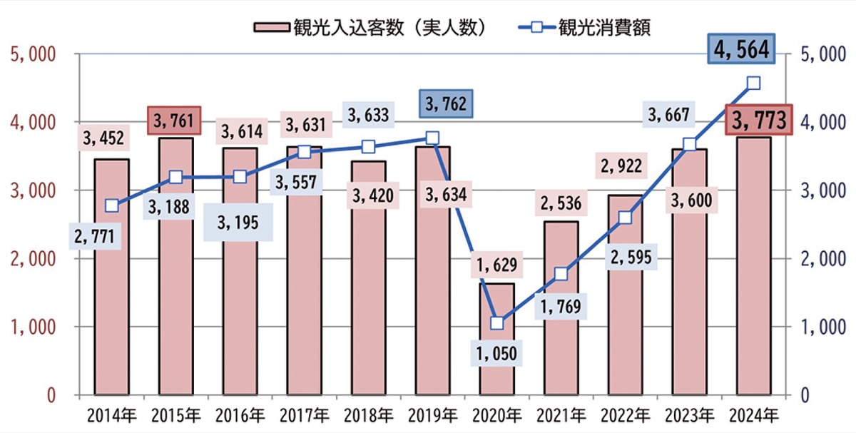 観光消費額の内訳は宿泊が2581億円、日帰りが1983億円。宿泊客の平均消費額は24年に5万553円と、右肩上がりで増加している。