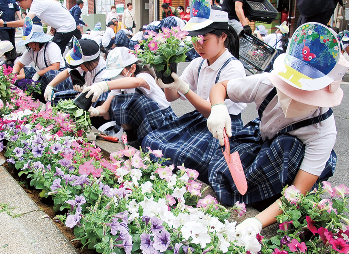 当日は、約30分ほどで花植えが完了。沿道が花でいっぱいになった。同学校の矢野虎太朗さんは「学校の近くの道路がきれいになって気持ちがいい」と感想を話した。