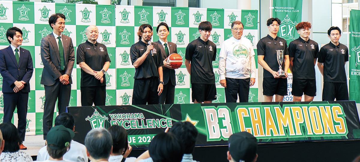 プロバスケットボールB3で今季優勝を果たし、来季からB2に昇格する「横浜エクセレンス(EX)」の選手らが6月20日、市庁舎1階のアトリウムでシーズン報告会を開き、ファン約150人が駆けつけた。