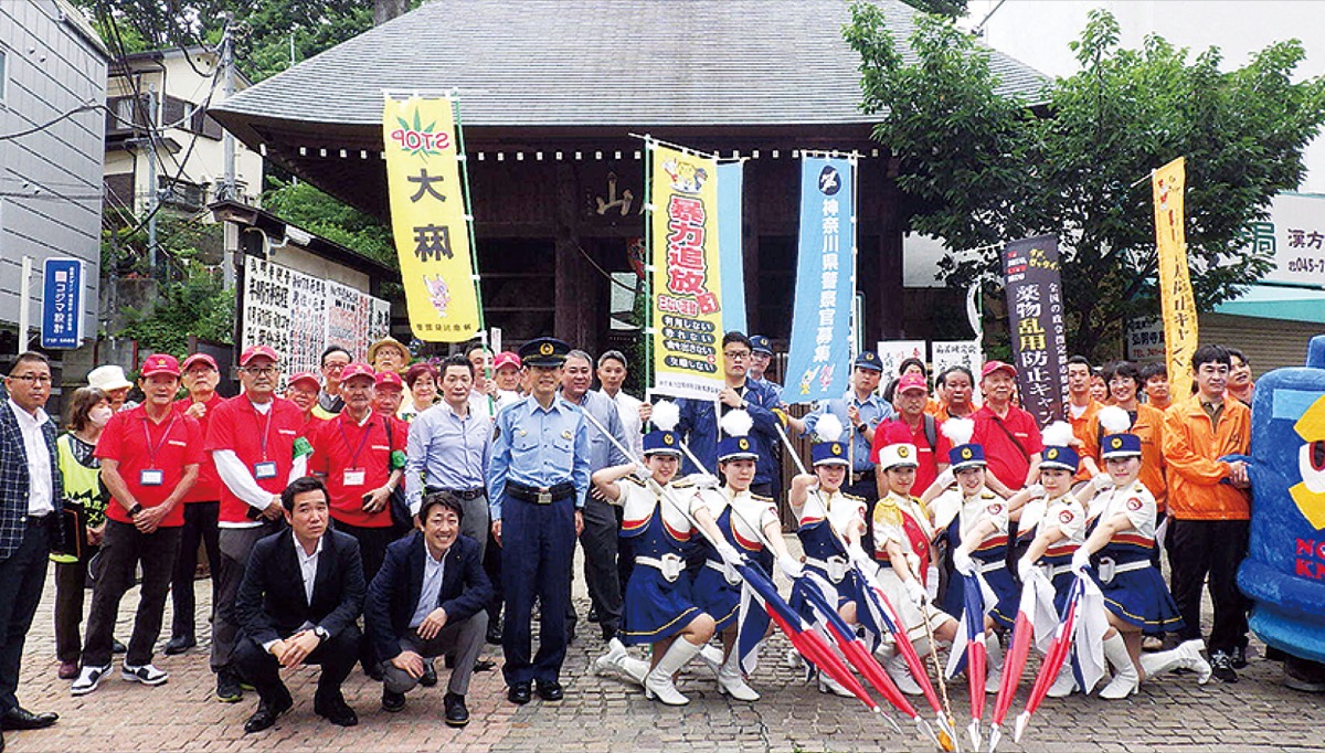 南区薬物乱用防止キャンペーンが6月15日、弘明寺商店街で行われた。主催となる南区薬剤師会(眞弓純会長)のほか南警察署、神奈川県警音楽隊、弘明寺商店街協同組合、県薬物乱用防止指導員協議会南支部などから約70人が参加。商店街をパレードしながら、チラシや啓発物などを配布し、薬物乱用防止などを訴えた。