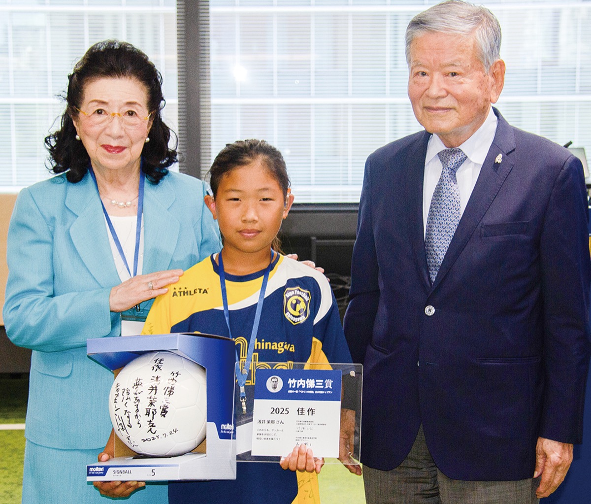 日枝小学校=南区山王町=4年生の浅井茉耶さんはこのたび、サッカーやフットサルに励む母子家庭の小学生を対象とした作文コンクール「竹内悌三賞」で佳作を受賞した。7月24日に表彰式が日本サッカー協会=東京都=で開かれ、審査委員長を務めた同協会相談役の川淵三郎さんから、記念品が贈られた。