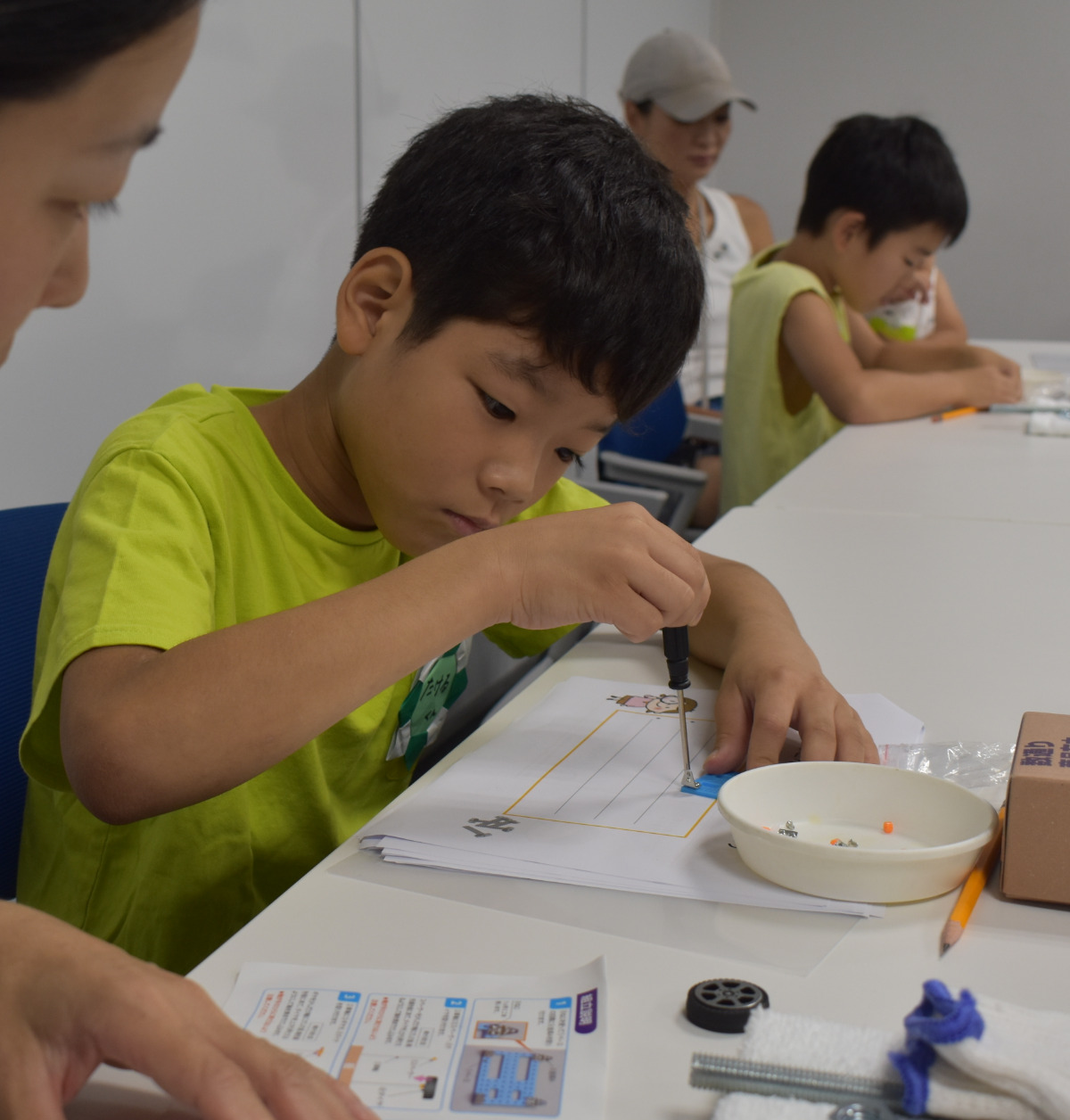 南区前里町のネジ専門商社「奥山製作所」は8月14日、南公会堂会議室でネジにまつわる仕事体験会を開催した。「夏休みの子どもたちに、体験の通してネジのことを楽しく知ってもらいたい」と同社社員の天野あゆみさんが企画。子ども5人と保護者が参加し、ネジを使った工作やゲームを楽しんだ。