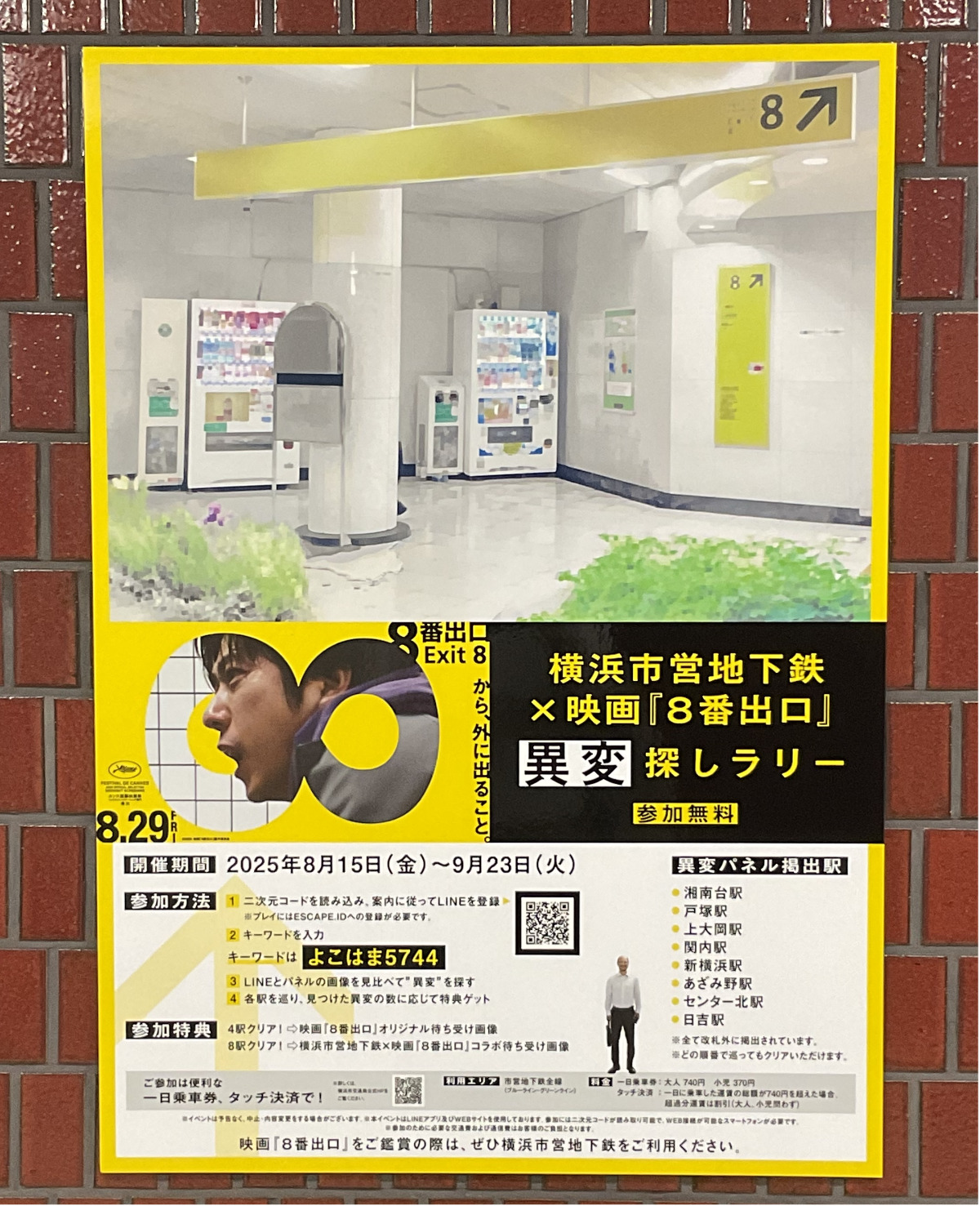 横浜市交通局は、8月29日(金)に公開される映画『8番出口』とのタイアップ企画として「異変探しラリー」を市営地下鉄構内で開催している。9月23日(火)の終電まで。