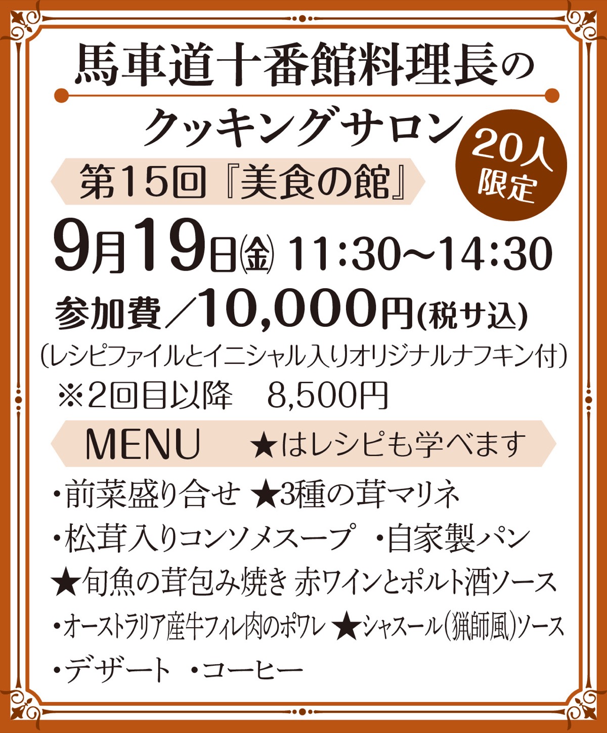 老舗フレンチレストラン「馬車道十番館」で9月19日(金)、料理長によるクッキングサロン「美食の館」が開催される。