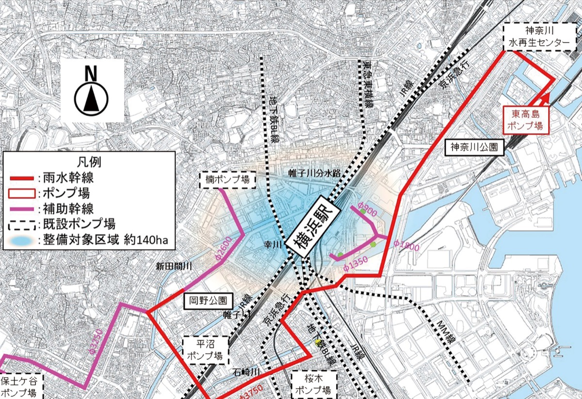 雨水幹線が整備されるのは神奈川公園から横浜駅の南側を経由し、西区の岡野公園につながる内径3・75m、全長約4・9Km。横浜駅周辺にあるポンプ場(平沼、桜木)をつなぎ、従来のポンプ場が帷子川や石崎川へ排水しきれなかった雨水の流入先として機能する。同幹線に流れた雨水は、星野町に今後新設される東高島ポンプ場から河口へと放出される。