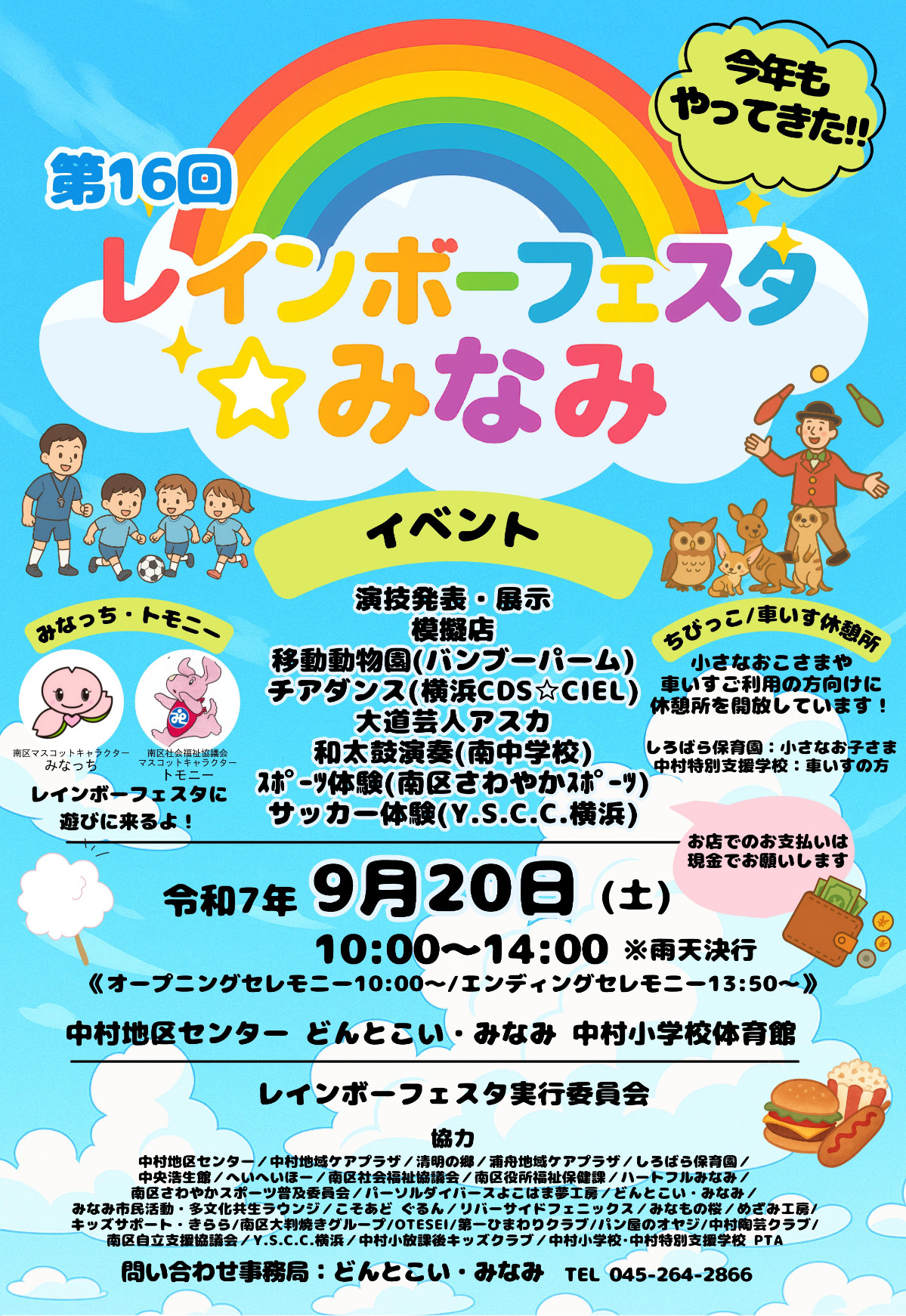 南区の中村地区の地域交流を目的としたイベント「第16回 レインボーフェスタ☆みなみ」が9月20日(土)午前10時から午後2時まで、中村地区センターとどんとこい・みなみ、中村小学校体育館で開催される。