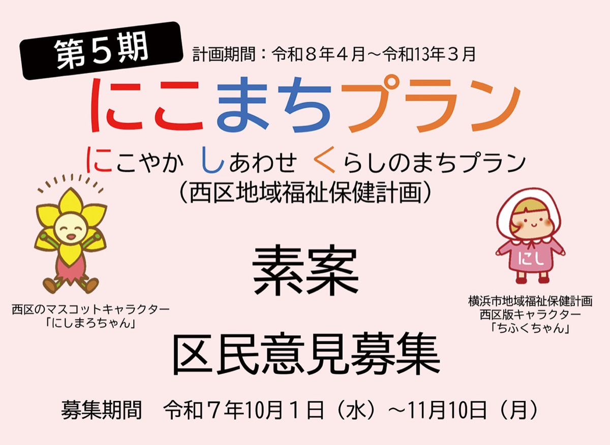 素案は、西区ホームページで閲覧できるほか、区役所や区内の地域ケアプラザ、地区センターなどに冊子を設置。意見や提案の提出はウェブのほか、メール(ni-nikomachi@city.yokohama.lg.jp)、FAX(045・324・3703)、冊子設置施設の意見募集箱への投函で受け付け。(問)西区役所福祉保健課【電話】045・320・8437