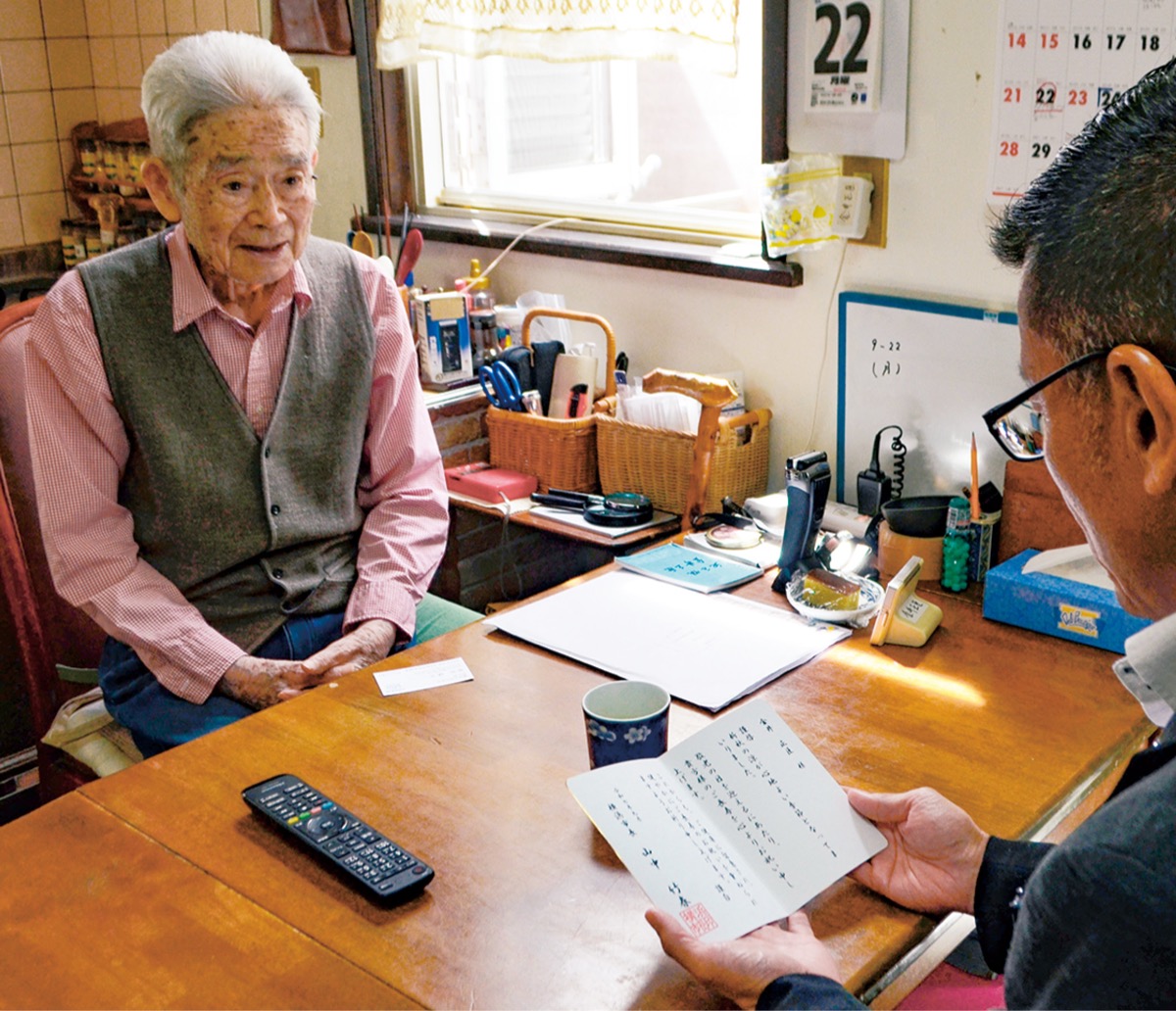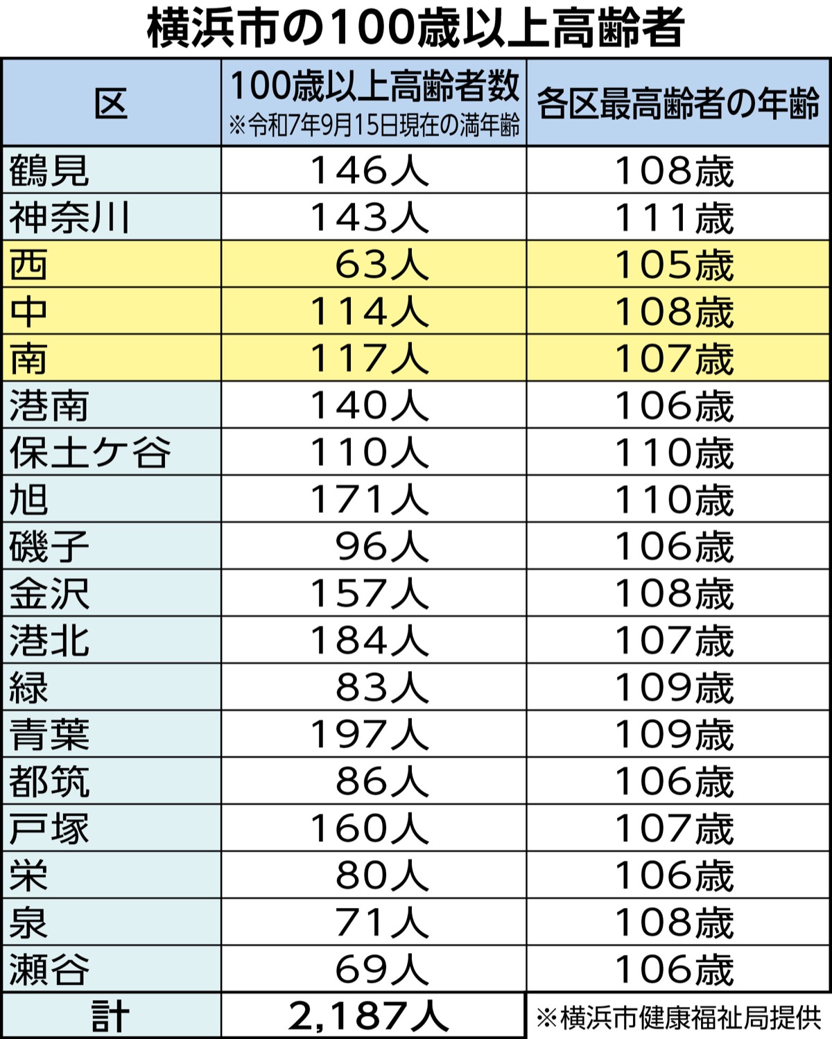 横浜市によると市内在住の100歳以上の高齢者は2187人で、中区は114人、西区は63人、南区は117人。市内の最高齢は神奈川区の京谷綾子さんで、9月29日に112歳の誕生日を迎えた。9月22日には西区の男性の最高齢者である金井正臣さん=西戸部町=のもとを菊地健次区長が訪れ、記念品を手渡した。