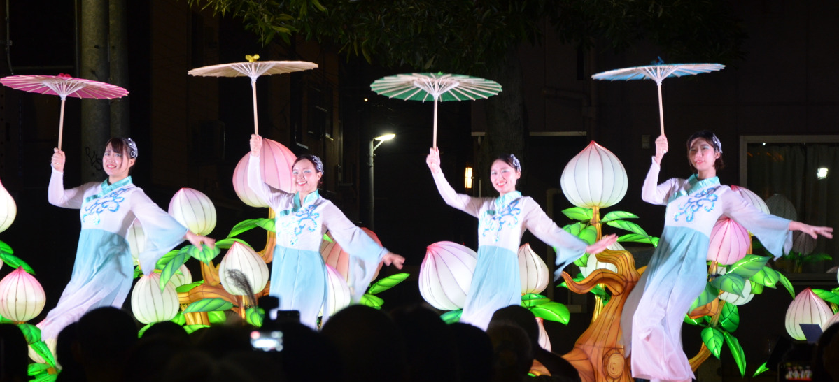 秋の夜長に中国の伝統文化を鑑賞しながら月餅を味わう人気のイベント。ステージに設置されたオブジェの幻想的な光に包まれながら、4団体が中国舞踊や楽器の演奏、変面のパフォーマンスを披露し、集まった約300人の来場客を楽しませた。