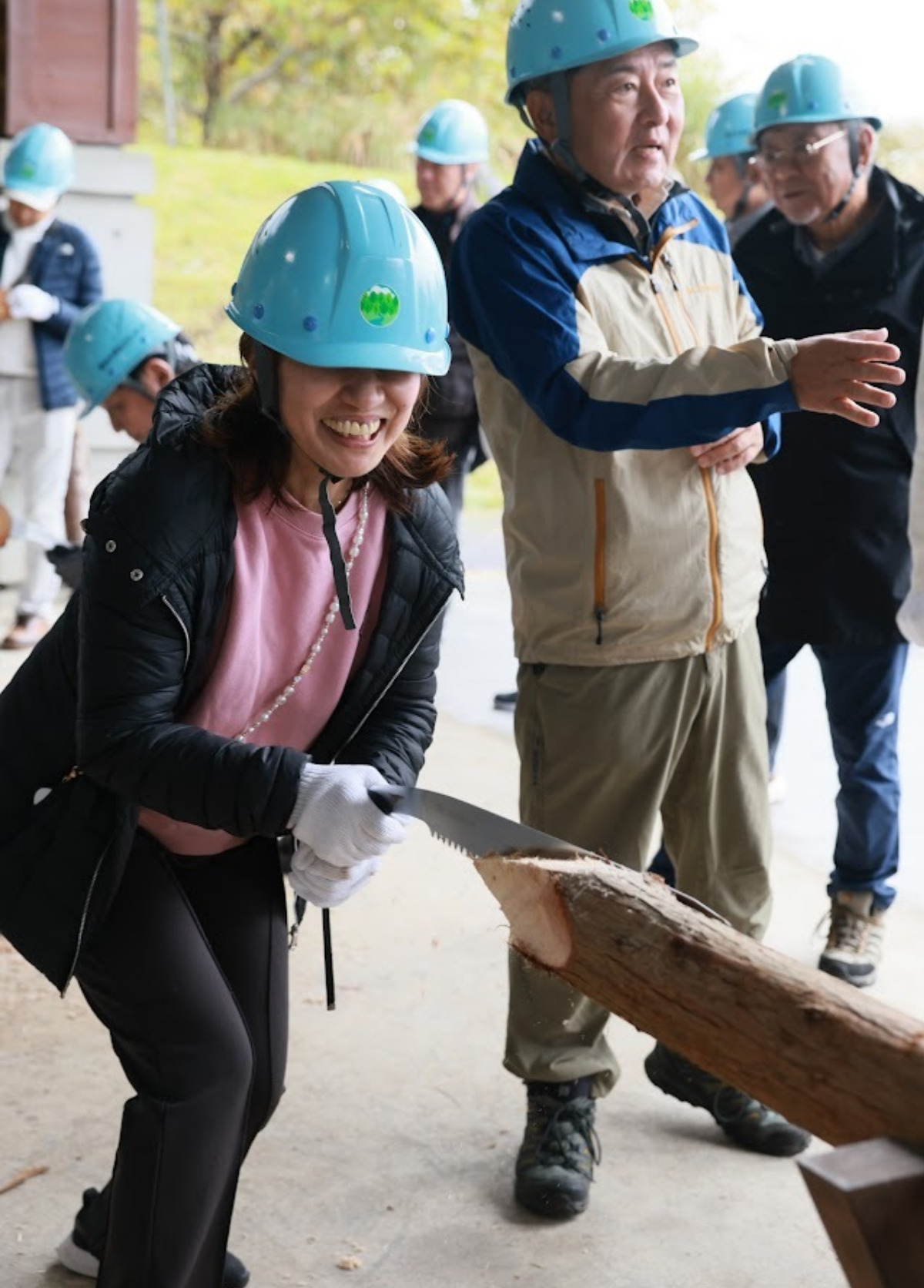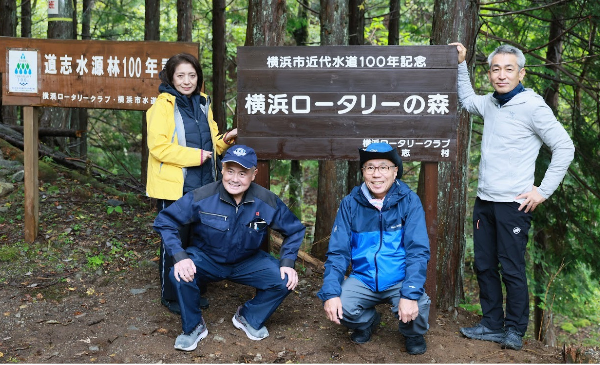 参加者は市水道局から水源林についての説明を受けた後、のこぎりで丸太を切り、杭を作る作業を行った。また、「横浜ロータリーの森」を示す新しい看板の除幕式もあり、大きな看板が森に設置された。