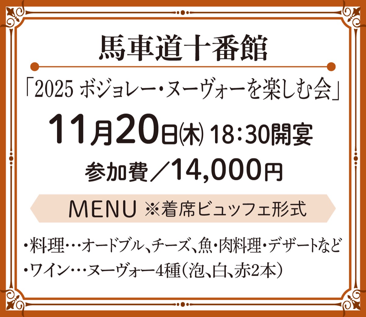 老舗フレンチレストラン「馬車道十番館」で11月20日(木)、「ボジョレー・ヌーヴォーを楽しむ会」が開催される。
