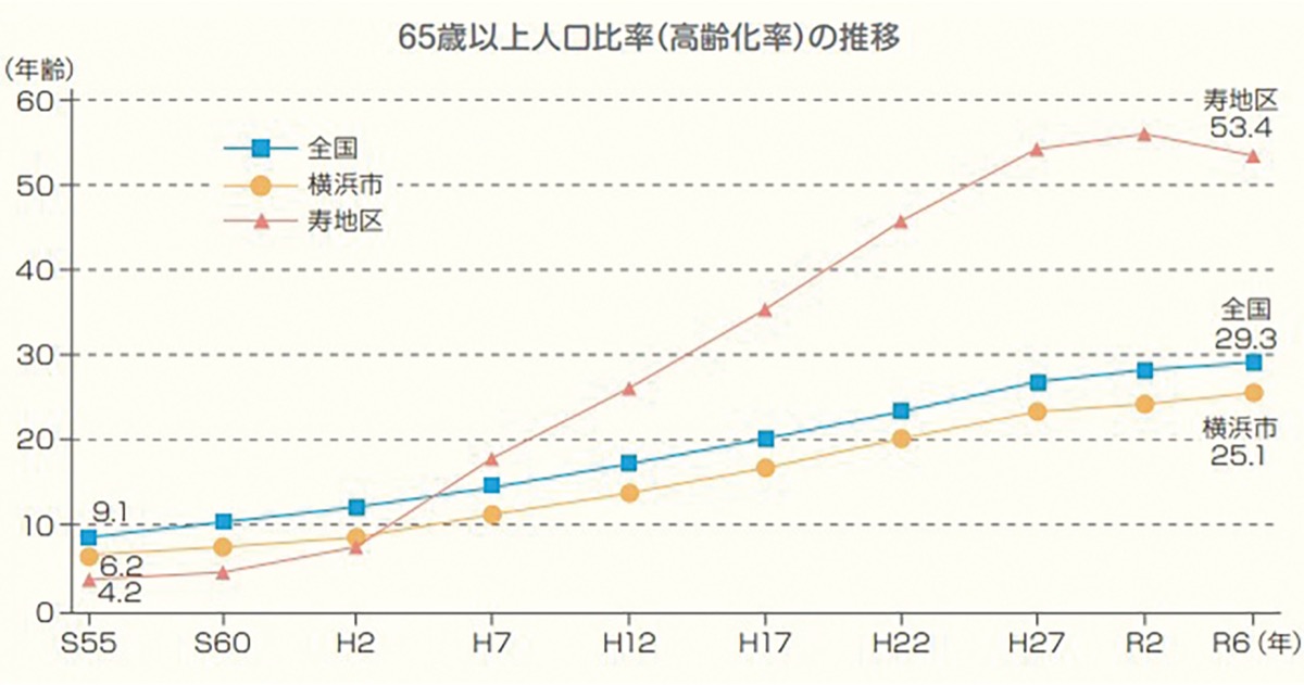 現在の寿町地区は、不法投棄されたごみの撤去や安全なまちづくりなど、行政と地域の人たちが協力して取り組んでいます。木造の簡易宿泊所が鉄筋コンクリート造りの高層建物へ改築されたり、一般集合住宅なども建設され、住環境が向上し、街の姿が大きく変わりました。しかし、今でも100軒以上の簡易宿泊所に約5300人が暮らしており、ほとんどが単身世帯で、生活保護を受給されている人も多くいます。高齢化率も50%を超え、全国の平均を上回っています。高齢者の中でも75歳以上が約半数を占め、介護を必要とする人も3割に達しました。労働者のまちから福祉ニーズの高いまちへと変容しています。