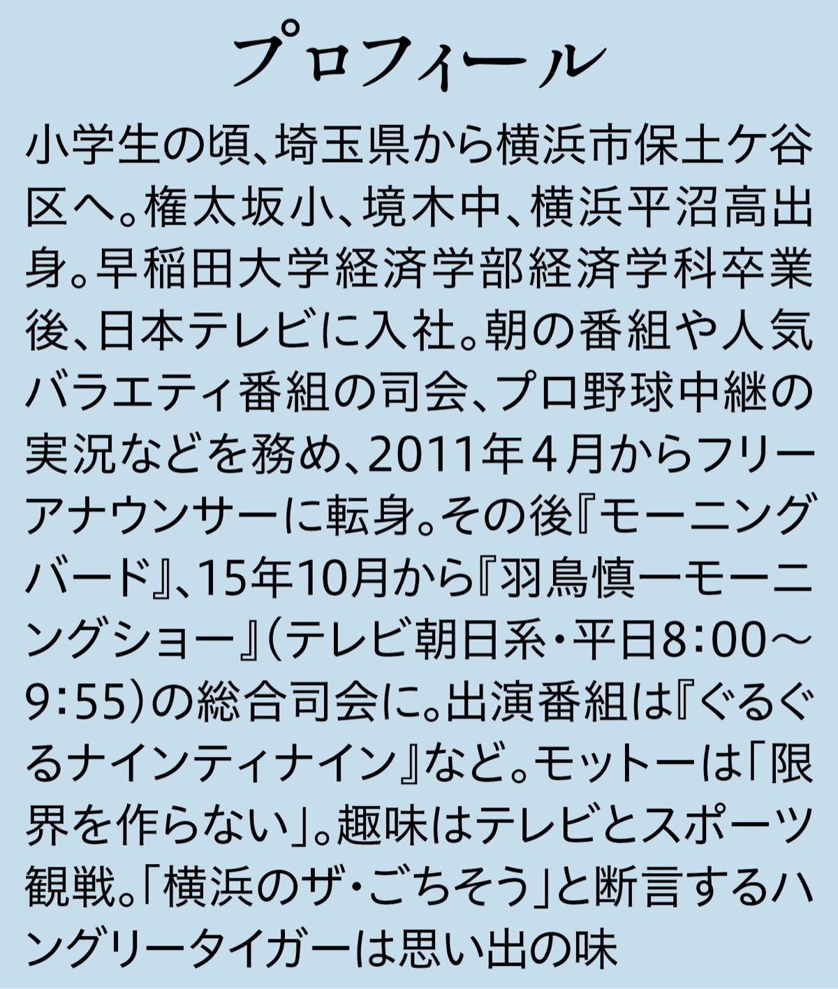 一浪して早稲田大学に入学。「楽しいことを仕事にしよう」と就職先を考えた時、頭に浮かんだのは高校時代に没頭した野球だった。「練習は確かに辛かったけれど、平沼の部活が本当に楽しかった」。テレビも好きだったことから、野球の実況アナウンサーを夢見て日本テレビへ入社。思春期だった中学時代は「笑ったところを見たことがない」と言われたほどで「『しゃべる仕事で大丈夫?』と同級生から心配されました」と笑う。野球実況の夢が実現し、スター選手を間近にワクワクした気持ちで仕事ができた一方、「選手の資料の準備や緊張の連続で全然楽しめなかった。実況担当を外れた時「これでビール飲みながら野球が見られるって思いました」と振り返る。