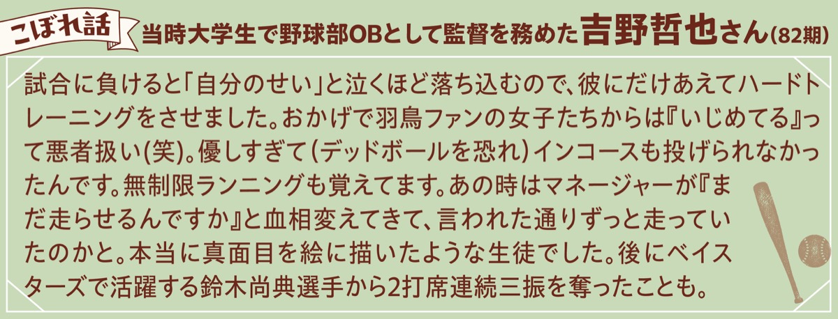 野球部エースに加えて長身、甘いマスク、優しい性格。ものすごくモテたのではと聞くと「クラスの人気者ぐらいまではいっても、そこは坊主頭の限界。結局モテるのはサッカー部なんです」と照れ笑い。また、学校の校舎については「卒業後に建て替えられたので今とは異なりますが、アーチ型の天井や飴色になった手すりなど、歴史のある場所で勉強しているんだなと思っていました」