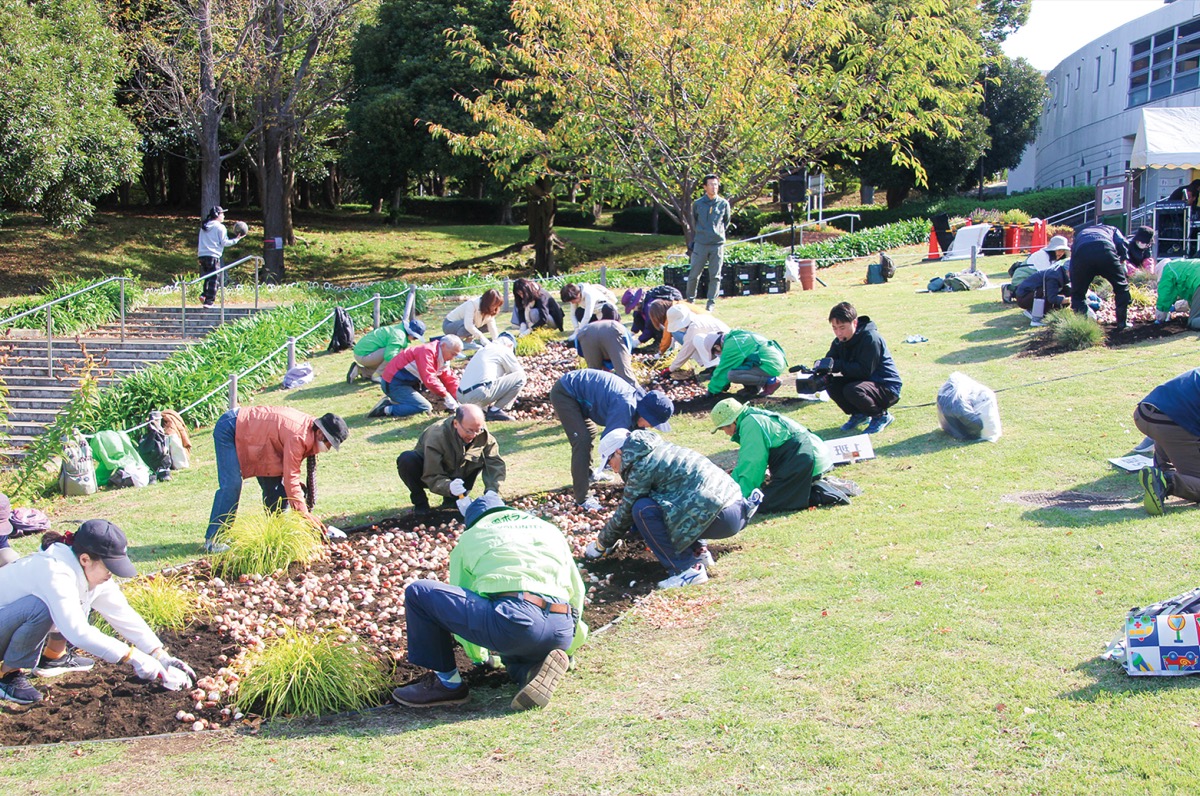 根岸森林公園では、参加者が、10カ所に分かれ花壇づくりを行った。チューリップやヒヤシンス、スイセンなど27種類の球根がたくさん入ったカゴが各所に置かれ、専門家の指導で、球根を撒く作業を開始。参加者は花壇全体に球根が広がるように工夫していた。その後、球根一つ一つを土のなかに植え付けた。