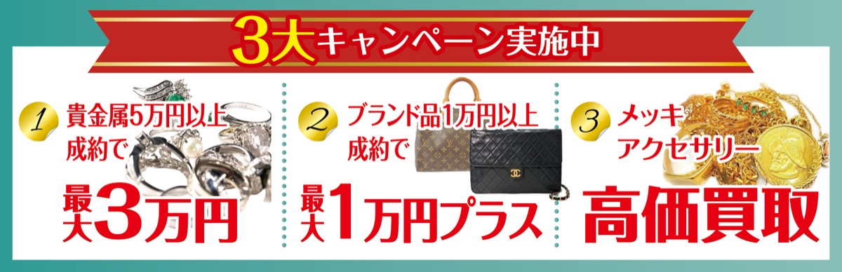 今ならお得な3大キャンペーンを実施中で、貴金属は5万円以上の成約で最大3万円プラス、ブランド品は1万円以上の成約で最大1万円プラスで買取。また、メッキアクセサリーも高価買取中。自宅に眠る不要品を売るなら今がチャンス。