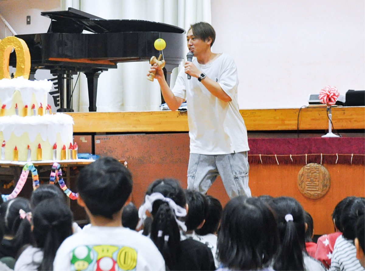 また、同校卒業生のけん玉パフォーマー・イージーさん=人物風土記で紹介=がパフォーマンスを行い、会場を沸かせた。