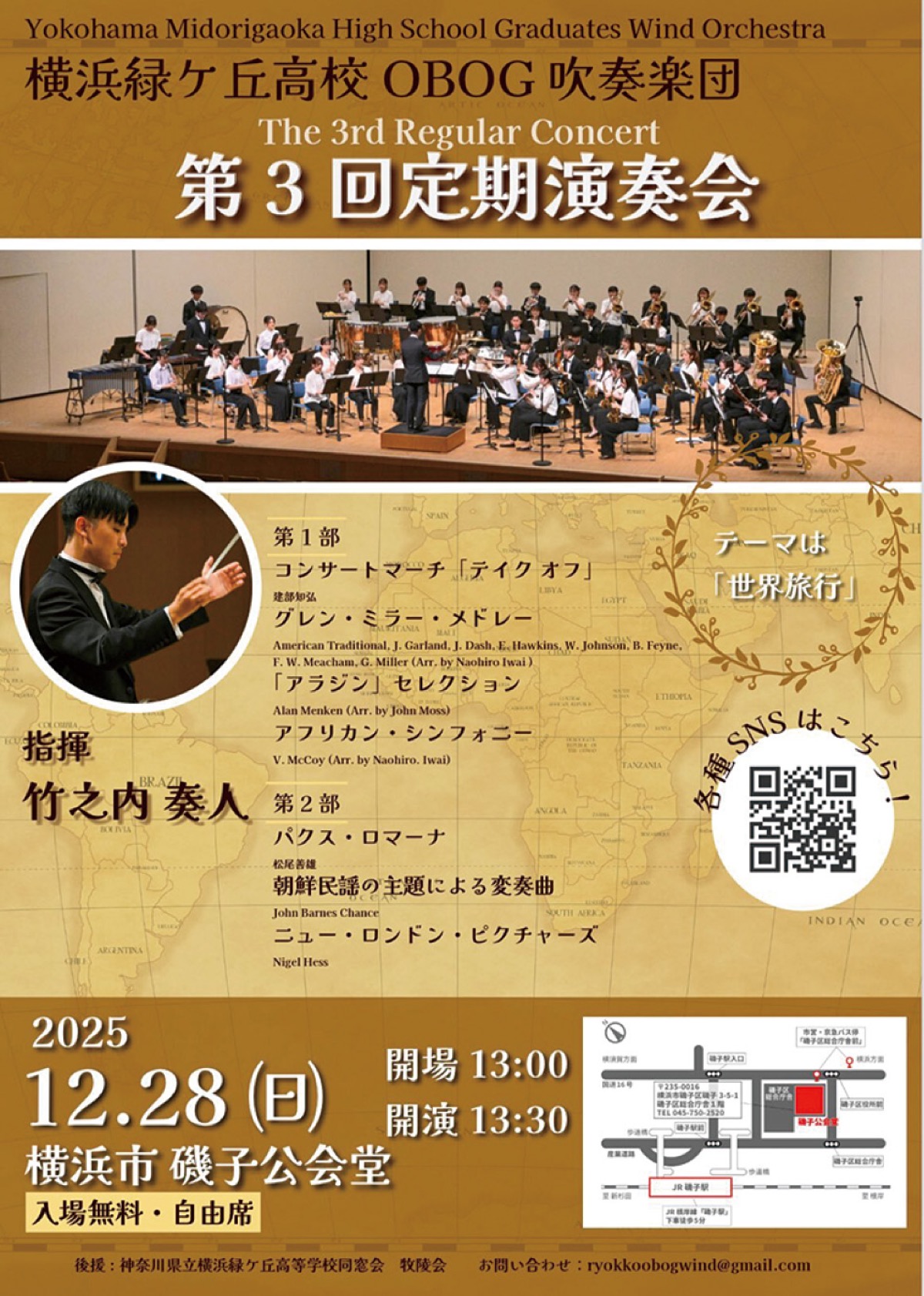 中区本牧緑ケ丘にある横浜緑ケ丘高校のOBOGによる吹奏楽団の「第3回定期演奏会」が12月28日(日)の午後1時30分から、磯子公会堂=磯子区=で開催される。