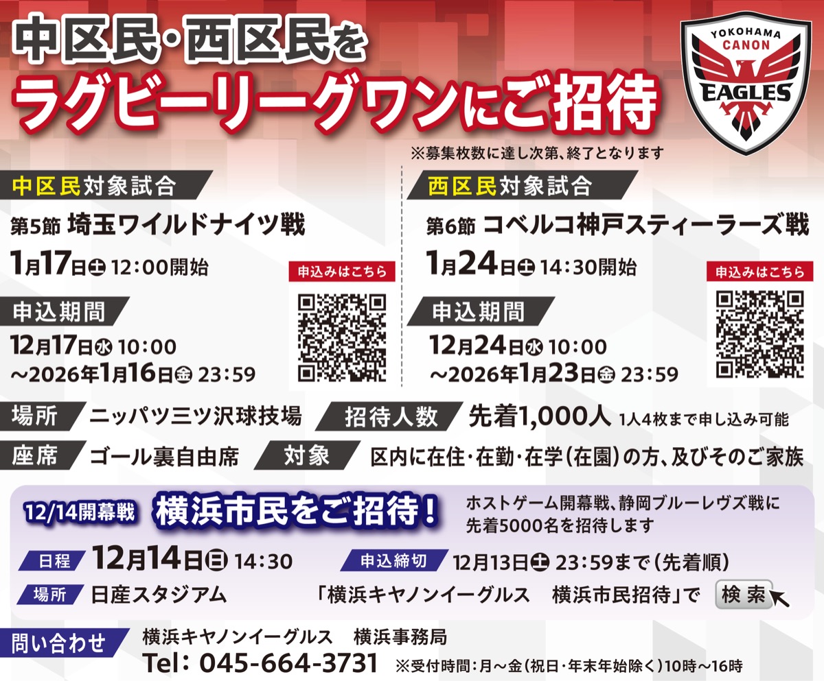 ラグビーリーグワンの横浜キヤノンイーグルスは、ニッパツ三ツ沢球技場=神奈川区=で行われるホストゲームを中区民、西区民を対象にそれぞれ先着順で招待する。対象は区内在住・在勤・在学(在園)の人とその家族。1人につき4枚まで申込み可能。席種はゴール裏自由席。