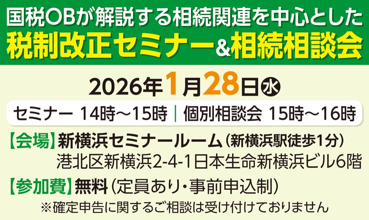 相続税に特化し、国内最大級の規模を誇るランドマーク税理士法人(全国15拠点、社員数600人超)が、2026年1月28日(水)、「国税OBが解説する相続関連を中心とした税制改正セミナー&相続相談会」を新横浜セミナールーム(新横浜駅1分)で開催する。