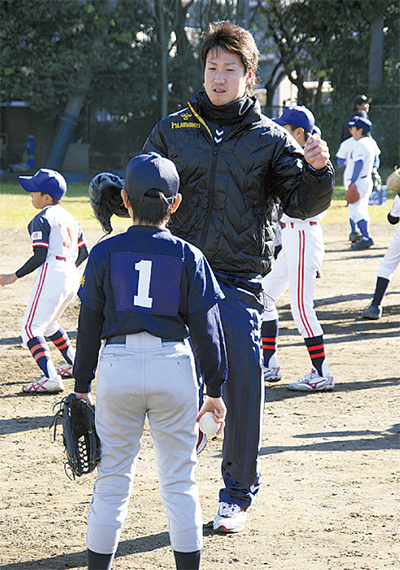 横浜商業高校の野球部OBが指導する少年野球教室が12月23日、同校で行われ、巨人の山口鉄也投手らが参加した。
